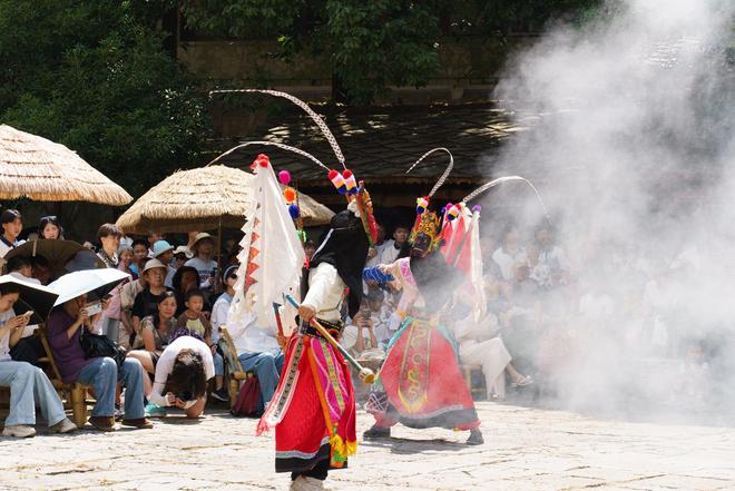 如今,为了便于游客观看,演武堂上演的地戏被精简到了10分钟左右,但这短短的时间里,却将地戏的精华展现得淋漓尽致,让现场的游客们看得如痴如醉,不时爆发出阵阵热烈的掌声。